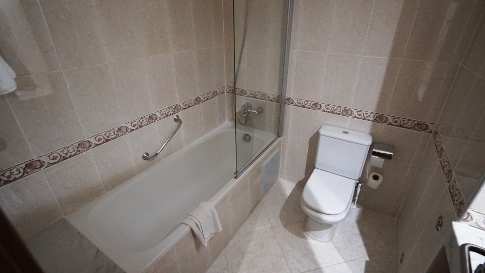 大きのバスタブあり、シャワーカーテンはありませんが、カラン側にガラスのシールドがついています。