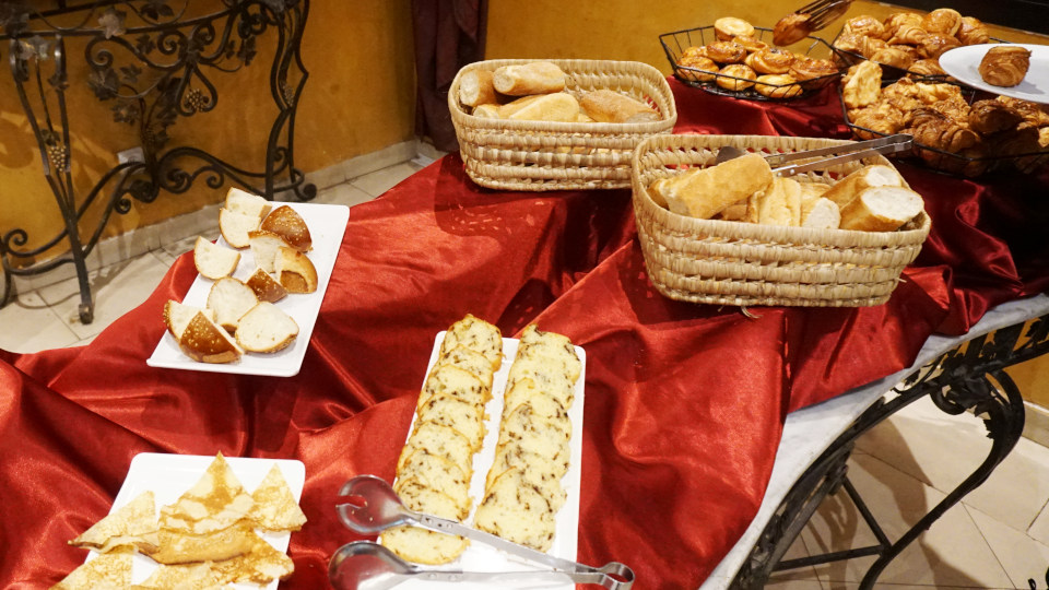 パンの種類はなかなか豊富、奥の甘系パンから手前にはパンケーキもあります。