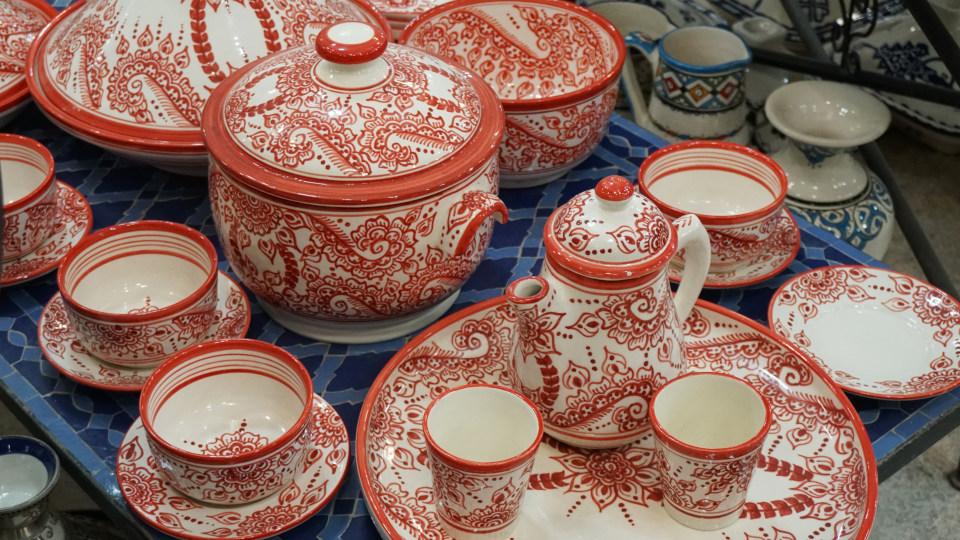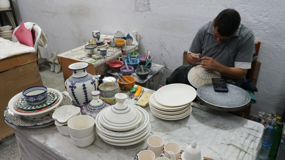 「タジン鍋」の絵付け実演、まだ時間が早いからなのか、職人さんはこの人だけでした。