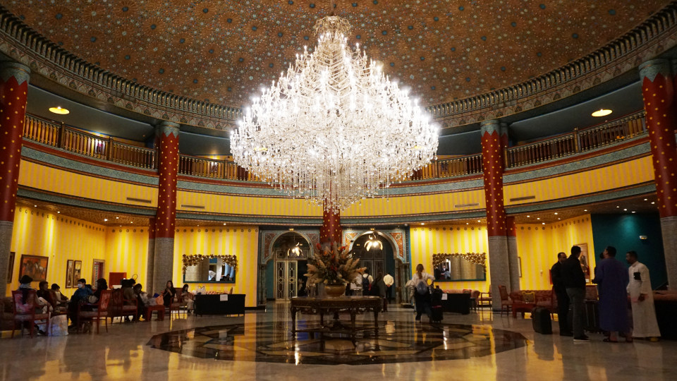 午後7時、今日のホテル「Grand Mogador Agdal」に到着、ランクは5っ星、HISのホテルランクでもデラックスクラスです、レセプションがあるロビー、シャンデリアが豪華です。
