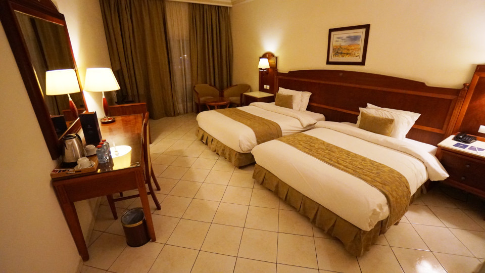 お部屋はこんな感じですが、え、ベッドが足りないんですけど、速攻で添乗員さんい連絡、添乗員さんも来てくれて、ホテルと交渉、ホテル側の言い分は「お客様が見えてからエキストラベットを入れるのわがホテルのスタイルです」とのこと?。