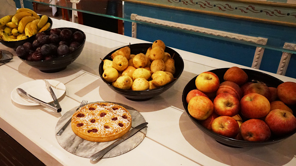 フルーツはあまり変わりません、定番のリンゴ、バナナに、洋梨、プルーン、手前の焼き菓子系は不明。