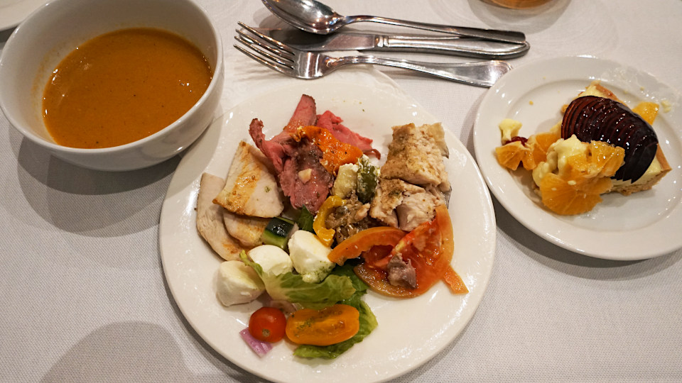 スープ、肉、野菜、チーズ、スイーツ、いつも通りにいろんなものを少しずつ。