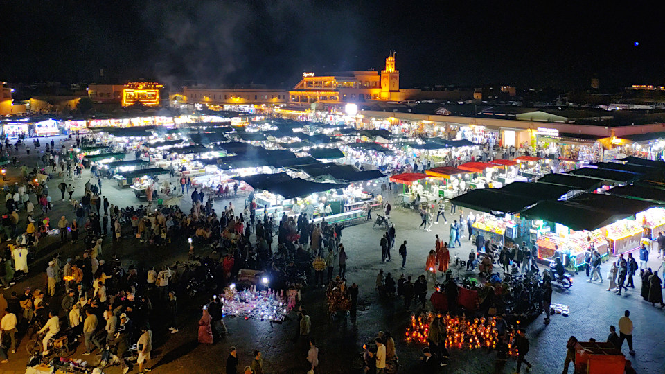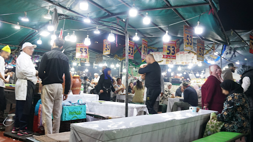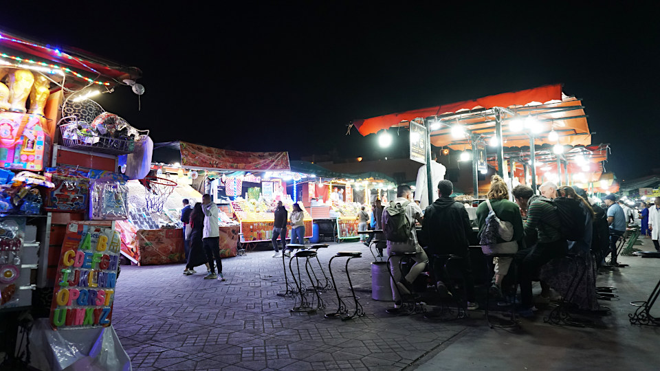 再び「フナ広場」が一望できるカフェ「Le Grand Balcon du Café Glacier」のテラス席へ、「マラケシュ」に来たらこの夜の雑踏を鑑賞しない手はありません、手前には昼間はいなかったランタン屋、路上に商品を並べた雑貨屋なんかも見ることができます、写真には夜だけの屋台の立ち上る煙まで映り込みます。