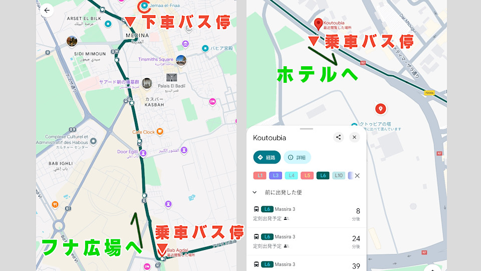 帰りは上のマップの「フナ広場」から一つ先の「Koutoubia」(クトゥビアの塔近く)から乗車することに、グーグルの案内では始発点22時の終バスです、やはり歩道にはにはバス停らしきものはありませんが、ルートちがいのバスが何台も停車し、それなりに乗車する人もいます、どこがバス停なのか地元の人は何を目印にしているか、やはりわかりません。