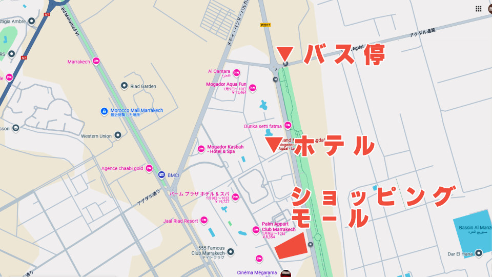 宿泊したホテルの周りは日本人ツアーが宿泊するハイクラスなホテルが集まっています、ツアーバスでつれていってもらった「AlMazar Mall Carrefour Marrakech」は南側に、そしてホテルの北側に「フナ広場」へ向かいうバス停があります、ホテルからはタクシーを利用する方が多いようですが、ここは公共交通機関のバスに挑戦。