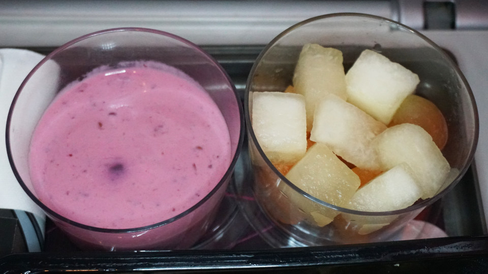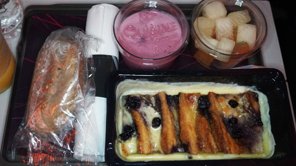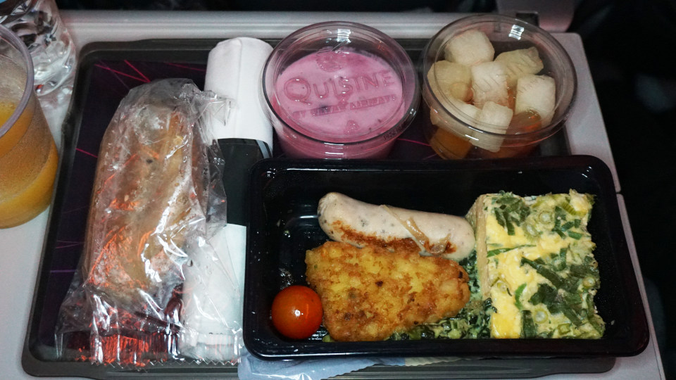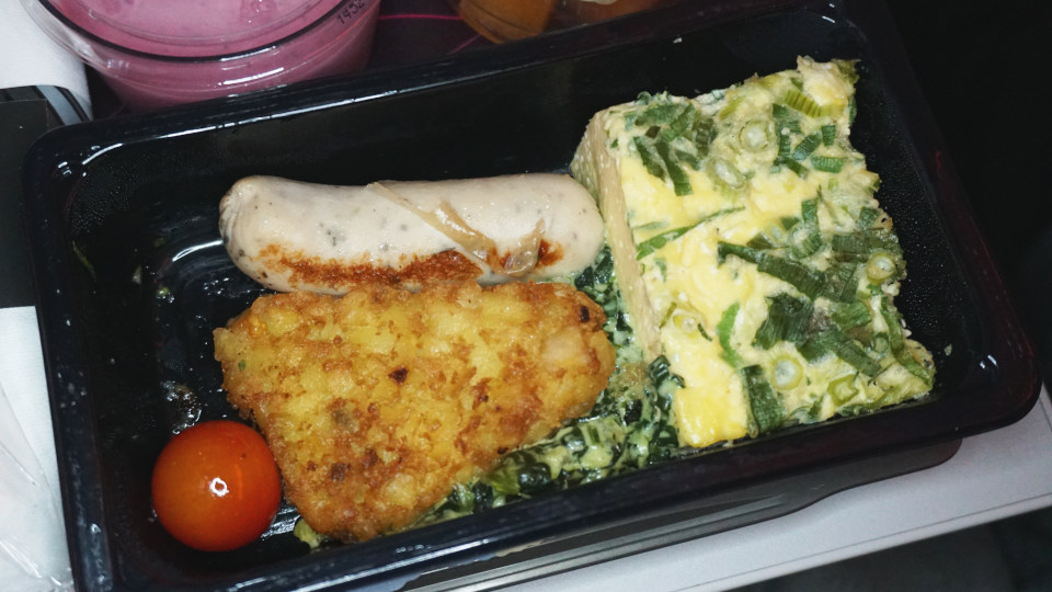 復路便ではほとんど寝るだけ状態、こうなると機内食だけが楽しみに、一回目の機内食サービス、ソーセージとオムレツとハッシュドポテト?このあたりに来ると記憶がかなりあいまいに。