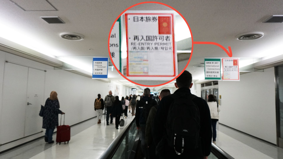天井にパスポートコントロールまでの案内があります、右側の赤枠の張り紙が日本旅券の方向け、緑枠は国際線乗り継ぎの案内、左側の青枠は外国旅券の方向け案内になっています、この案内もう少し大きな電光掲示でもいいと思いますが。