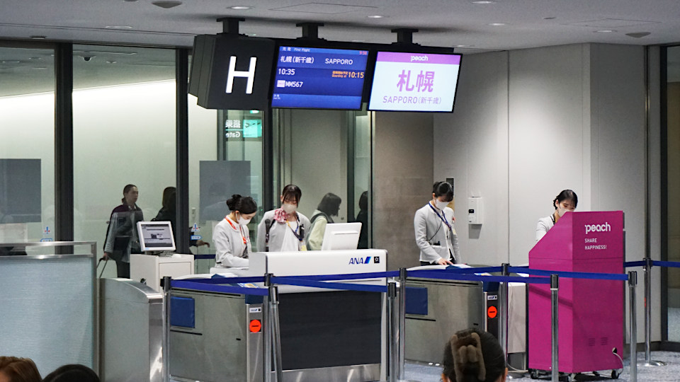 ピーチアビエーションのチェックインカウンターは第1ターミナル南ウイングの1階、国際線到着フロア端にあります、自動チェックイン機を使用して搭乗ロビーへ、この時の搭乗ゲートは「H」でした。