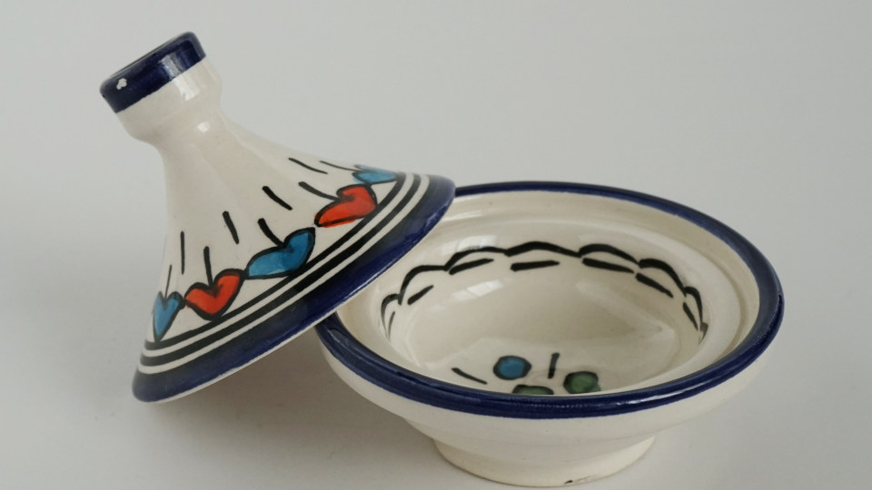 「フェズ」の陶器屋さんでもらった、高さ5センチほどのミニタジン鍋、なかなか可愛い絵柄が当たりました。