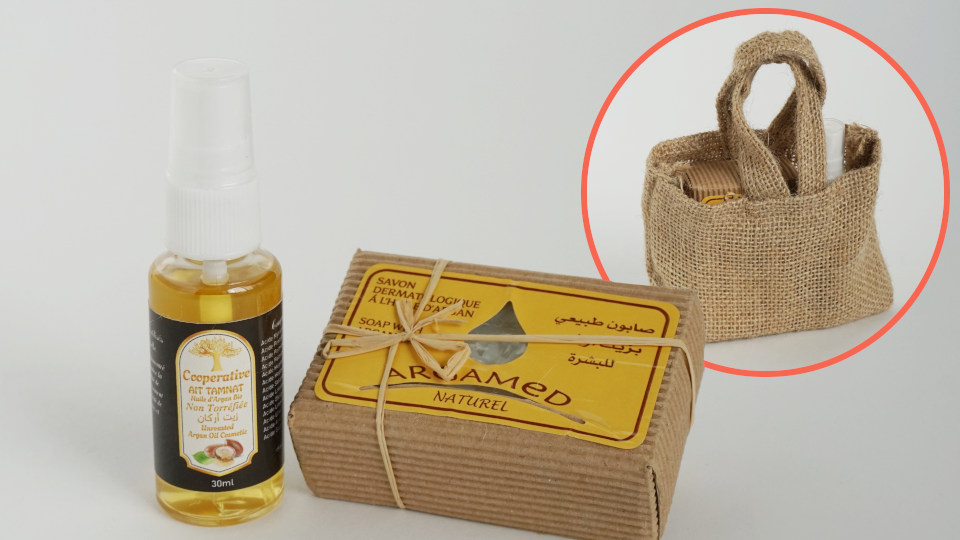 アルガンオイル店でのいただき物、とても小さなざっくりした麻のバックに入ったアルガンオイルと石鹸、サイズは販売している小サイズのモノと変わりません。