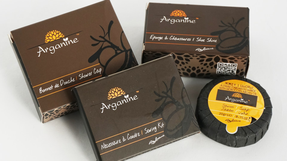 マラケシュのホテルのアメニティー、シャワーキャップ、靴磨き、ソーイングセット、石鹸。