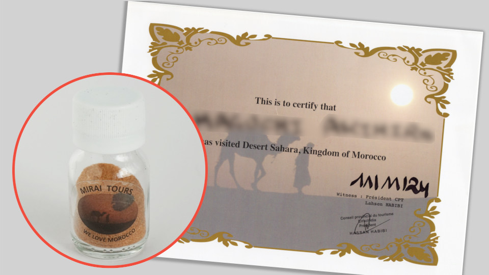 モロッコ王国サハラ砂漠訪問記念の証書?A4サイズの大きなもので真ん中に名前が入っています、左側は同時にもらった小瓶に入ったサハラ砂漠の砂、中に小さなアンモナイトの化石?も入っていましたが、本物?。
