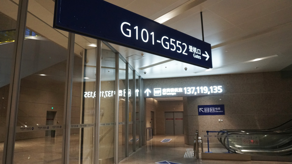案内表示に従って少し暗めの場所を移動、あまり人も通りません、奥にラウンジ137、119、135の表示がありますが、覗くと直行のエレベーターの乗り口、ここはまともに「G」搭乗ゲートの案内に従ってエスカレーターへ。