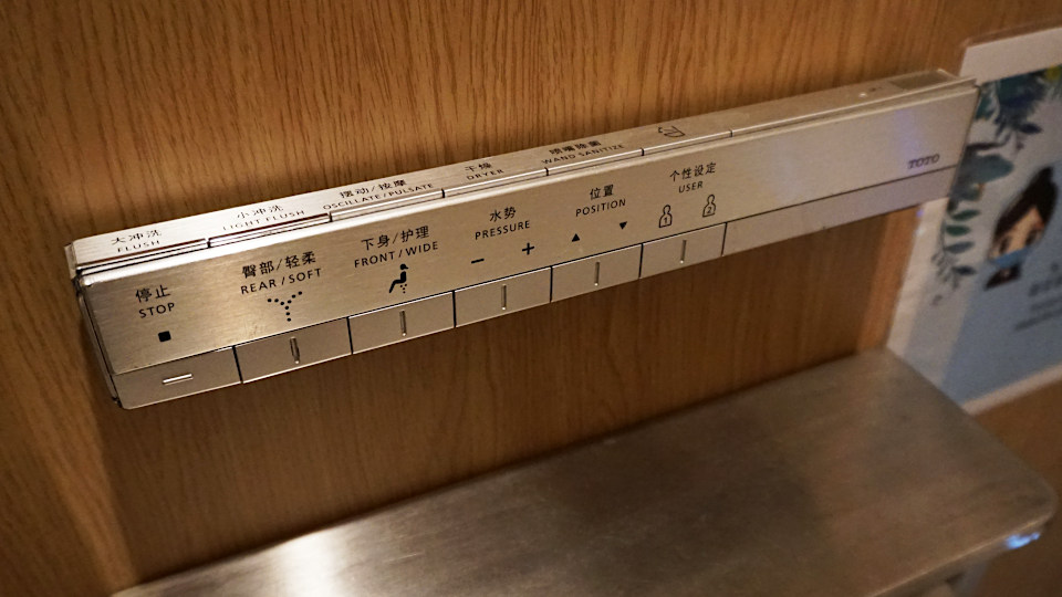 トイレのウオッシュレットの操作ボタン、TOTOの製品はなんですがボタンの数が豊富、さすがに有料ラウンジのトイレ。