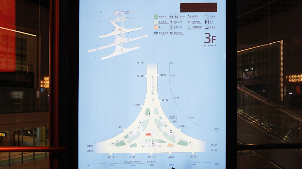 3階フロアの中心にある搭乗ゲートの案内表示、ほぼ三角形の底辺の直線部分にゲートG116~G122が並びますが、端から端まで630メートルの表示、ゲートG119はほぼ真ん中にあります。