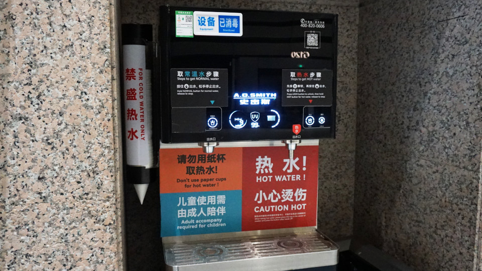 中国の空港には必ずある温水器、もちろん熱湯も出ますが、このフロアにカップ麺を扱っているような所はないようなので、現地調達で食べることはできません。