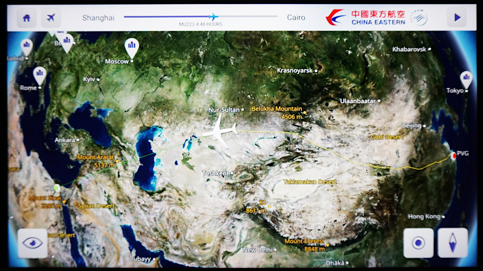 エジプト、カイロ国際空港までの乗り継ぎ便、01:30発 MU223に搭乗、仕様機材はA350、シート配列は3-3-3です、この便も事前に無料座席指定を航空会社のホームページから済ませています。