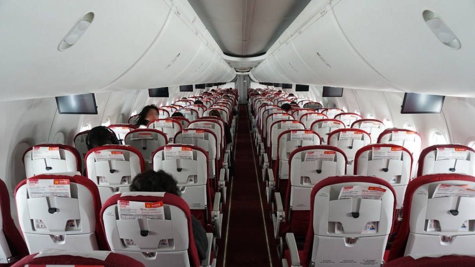 機内後方からの様子、搭乗率は50パーセントくらいでしょか、こんなに乗客が少ない状況はあまり乗らなくなった国内線を入れても久々、ワシらは通路側の席を指定したので、三席の中央と通路側、窓側の席は空席となって楽楽でした。