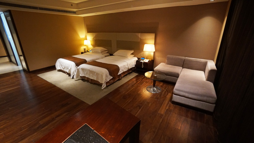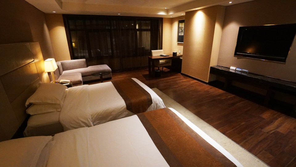 空港から1時間ほどで到着のホテルは「西安ヨーホルホテル」、漢字表記は「西安悦豪酒店」同じホテルに3連泊になります、ドア側からの室内の様子。