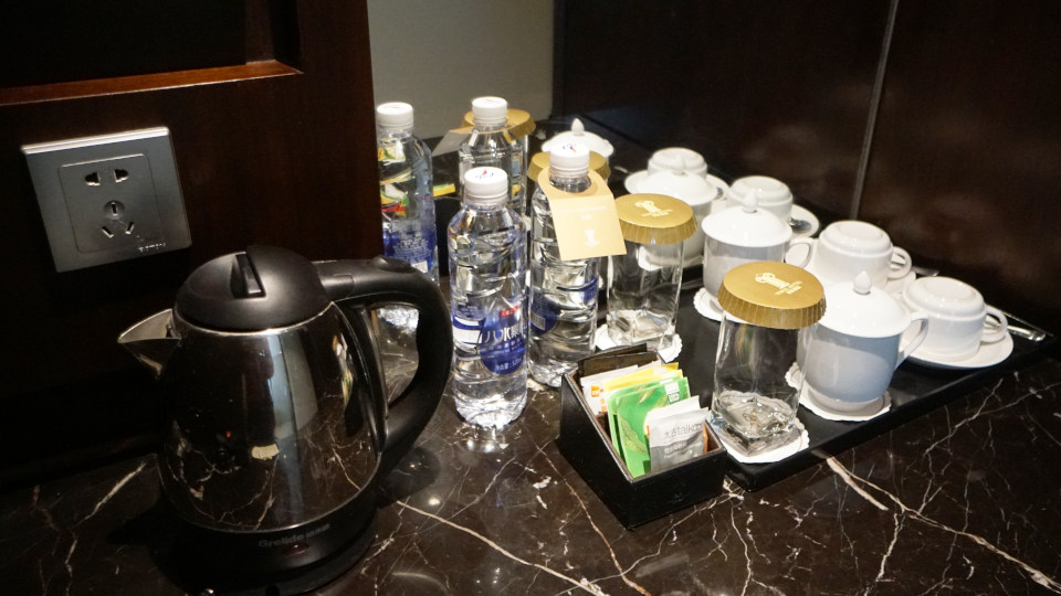 サービスのミネラルウォーター、コーヒー・紅茶のセット、もちろん電気ポット、コンセントは左側に映ってますが、日本のプラグがそのまま使えました、下は方は中国式のO型のコンセント。