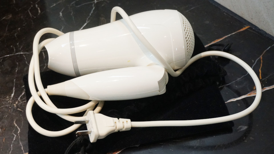 洗面台の右隅に黒い袋に入ったドライヤー、プラグは日本のモノと同じです。