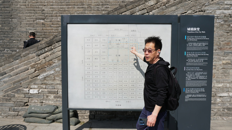 当時の長安の地図をガイドする単さん、「西門」は長安の城壁にある最大の門で二重構造になっており、かつてはシルクロードへの出発地点となっていた。