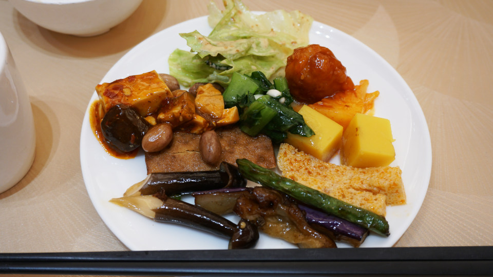 取り皿に少しずつ、とにかく種類が多く詳細は不明「精進料理」なので野菜やお豆腐の料理が多いようです、炒飯もありました、基本的に薄味ですが美味しい料理です。