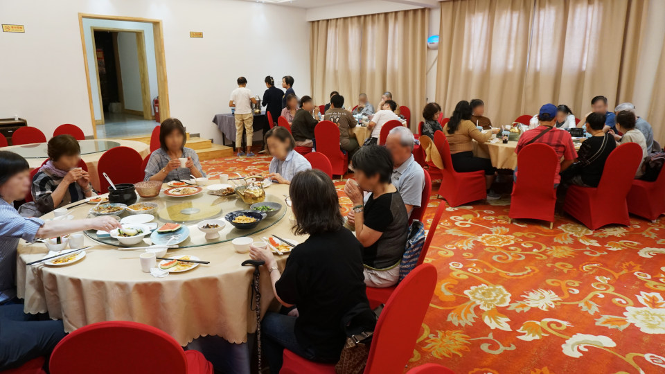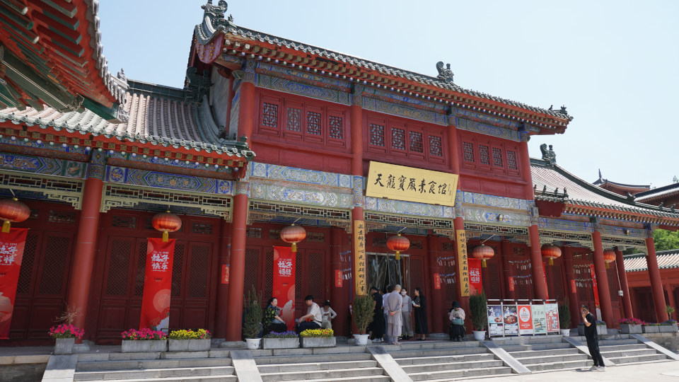 さらにバスで移動、今日の昼食「精進料理」のレストランへ、外観はまわりの建物と一体化しているんですが、掲げられた看板には「天龍宝燕ベジタリアンレストラン」とあります、ここまでくると歴史的建造物なのか、それを利用したショップやレストランなのがわからなくなります。