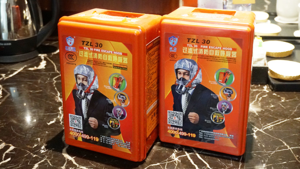 クローゼットの反対側の扉には、貴重品管理の金庫もありましたが、目を引いたのはこの防災用のマスクです。