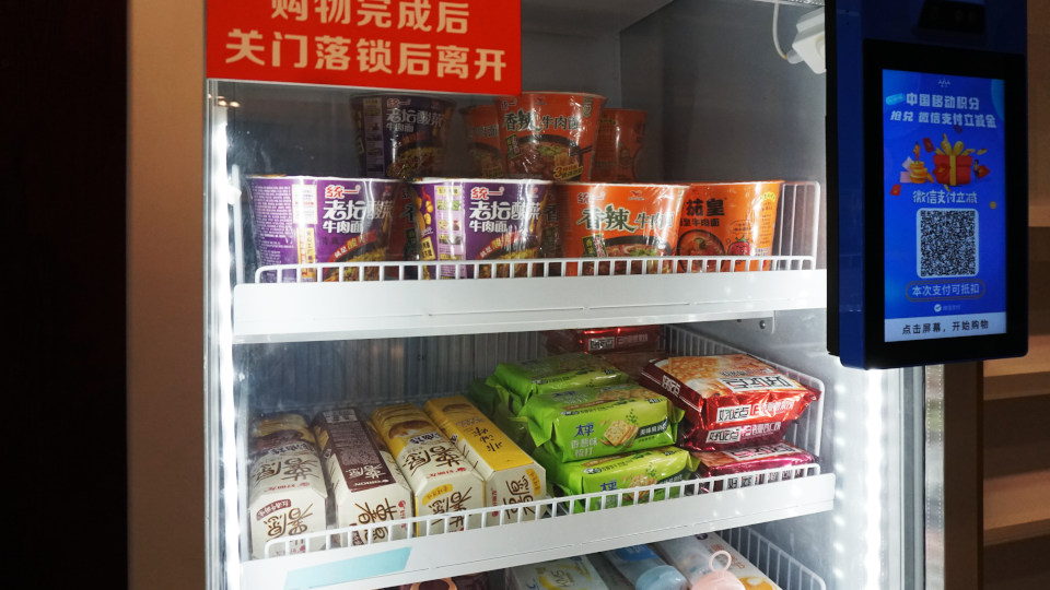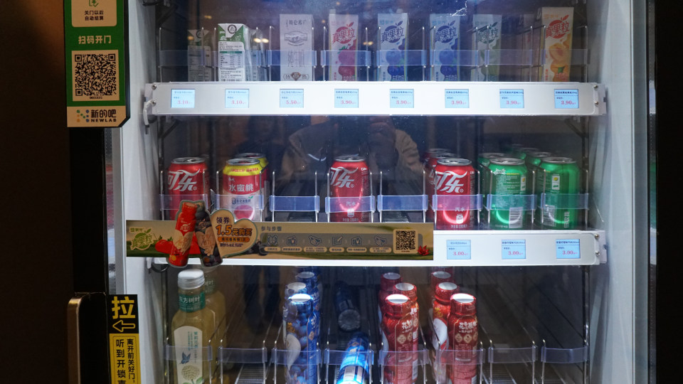 自販機には現金用のスロットなどはなくキャッシュレス決済、左側の自販機にはパックジュース3.9元、牛乳も入っていて5.5元、コーラ、スプライト3元、などのソフトドリンクが収納されていて、料金も明示されたいました。