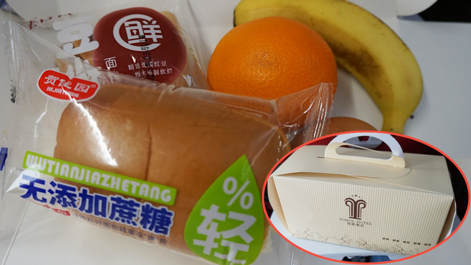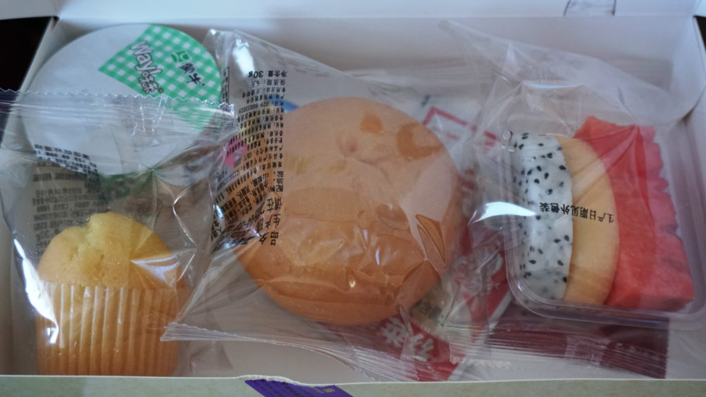 ボックスの中にはヨーグルト、マフィンのようなお菓子、パン、カットフルーツにはドラゴンフルーツ、メロン、スイカ、下にカトラリー、ナプキンなど。