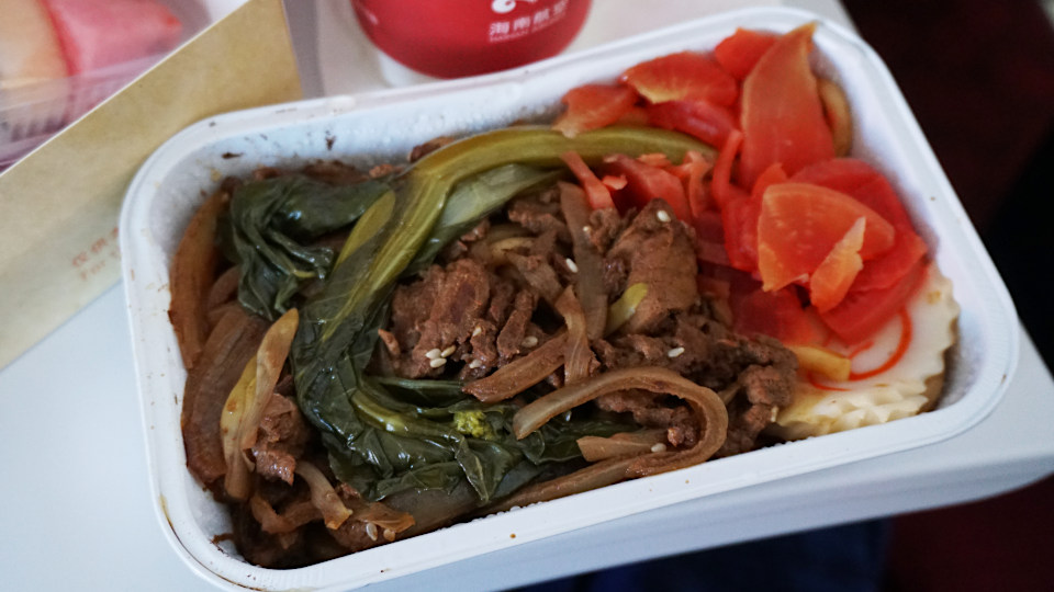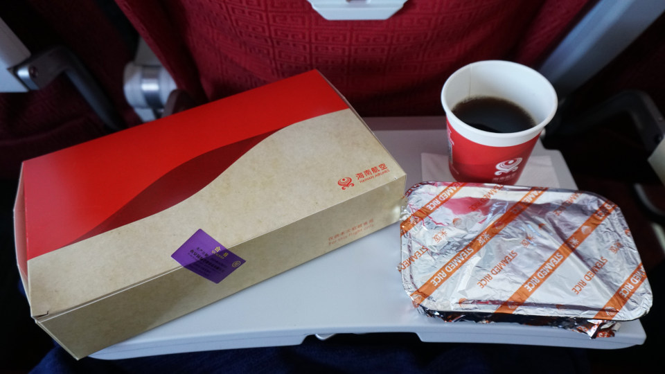 復路便でも搭乗率はほとんど変わらず、窓側席が空いているので座席もゆったりと使えますもちろん機内食のサービスあり、復路はボックスのデザインが少しちがいます。
