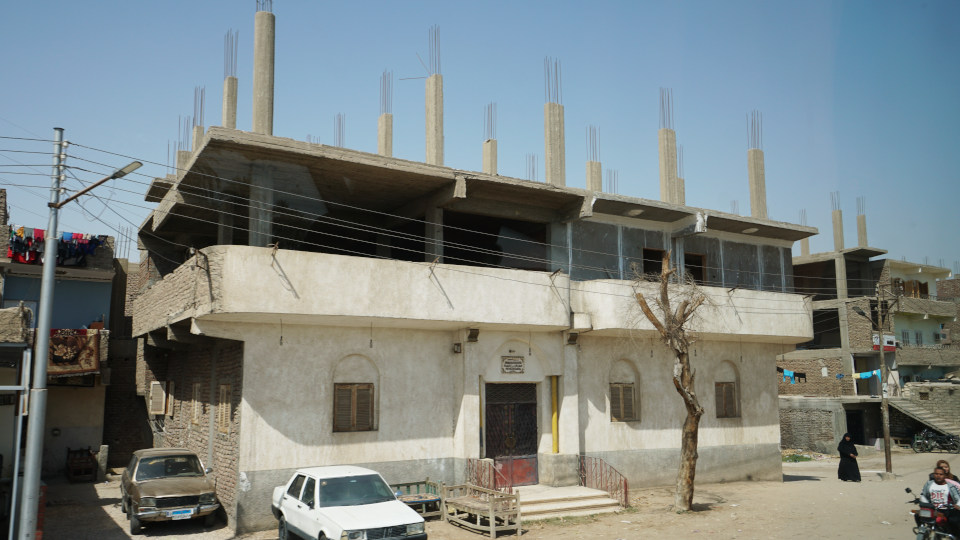 移動中のバスの車窓から、エジプトの大き目な住宅は上に増築ができるように、柱が先に建っています、エジプトでは「一夫多妻」が今でも認められていて、お金持ちほど家族が増える?から、でしょうか。