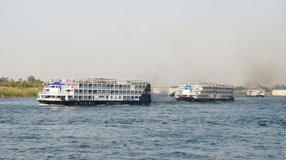 ナイル川を南下するクルーズ船、船によってかなり巡行スピードが違うので、追い抜いたり、抜かれたり。