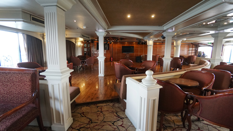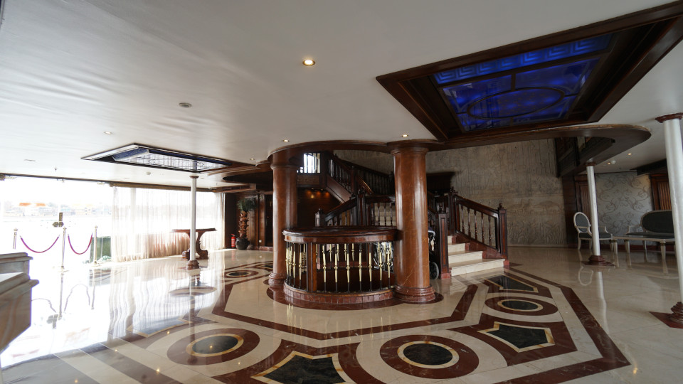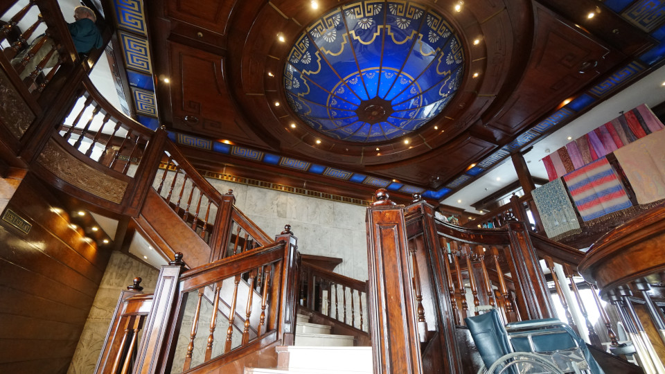 時間がたっぷりあるので船内の探索、レセプションのあるフロア、左右に開口部があってそこから乗り降りすることに、中央にはクラシカルならせん階段が。