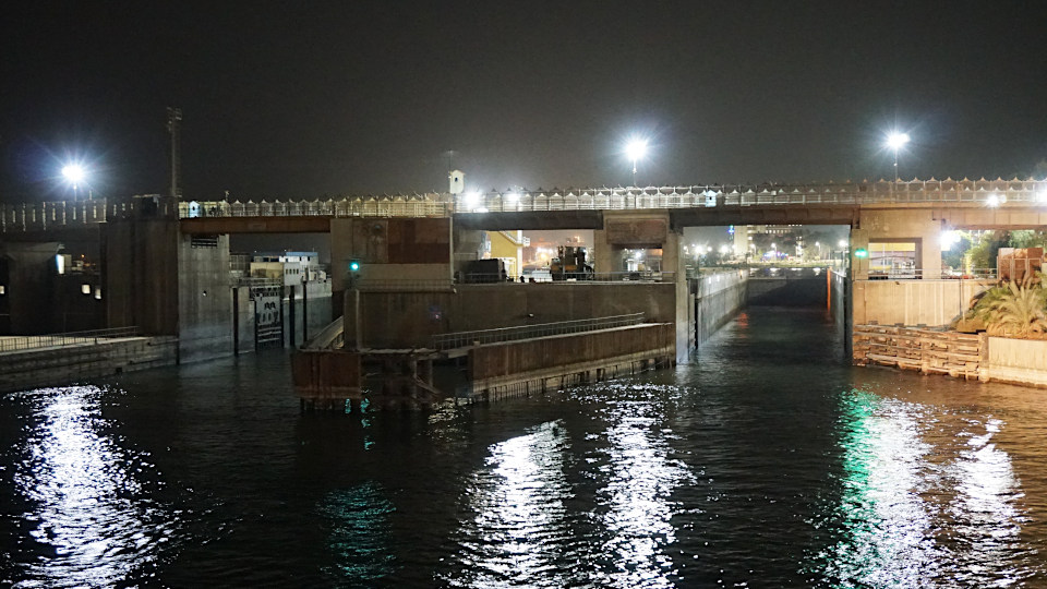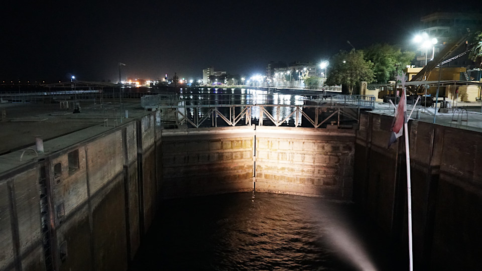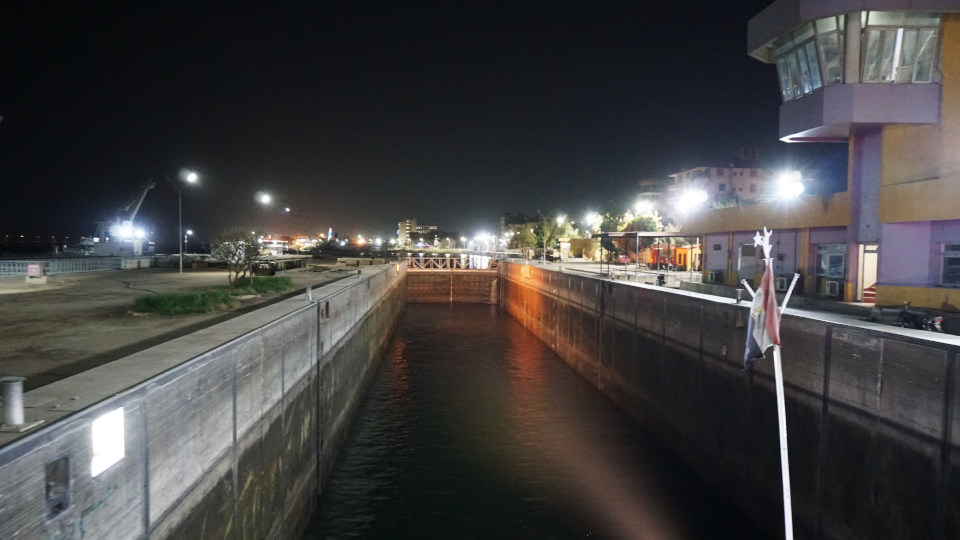 時間は午前4時近く、「エスナの水門」(構造からは正しくは「閘門」と呼ぶようです)のドックは2本あるようで、ワシらのクルーズ船は進行方向右側のドックへ、慎重に進入します、周りは真っ暗です、Googleマップによれば「水門」は左手に対岸まで延びているようです。