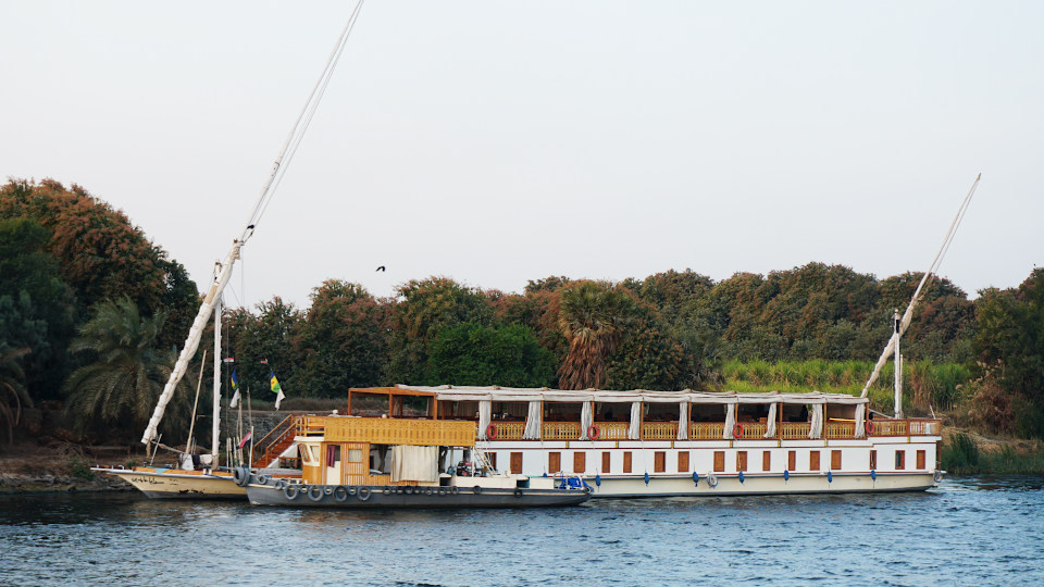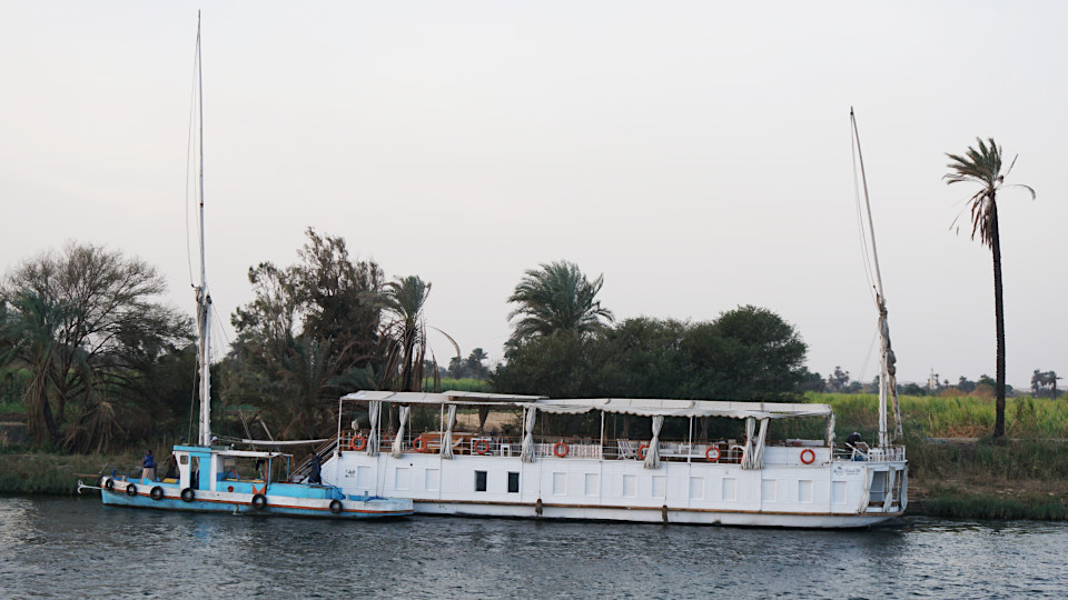 水門を越えた早朝のナイル川にこの形式の船をよく見かけます、2本マストに畳まれた帆、2階は風通しが良いオープンデッキ。
