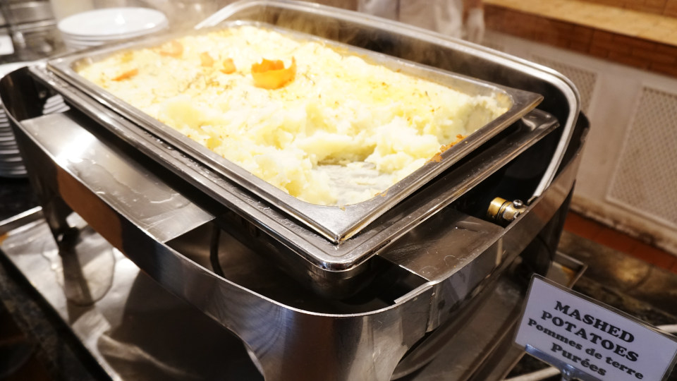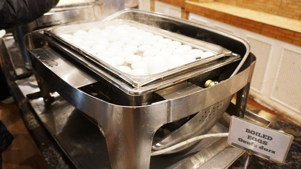 クルーズ船、3日目の朝食、ここでお料理の名札の存在に気が付きます、今までもしかりついていたんでしょうが、気持ちがお料理に向いていて見落としてました、で、見た目でも問題なくわかるゆで卵。