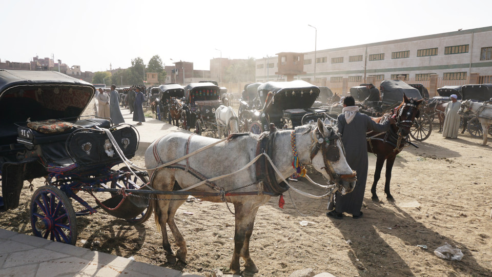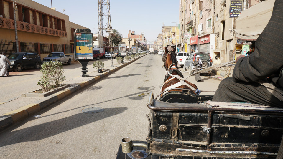 「エドフ」西岸の船着場で下船して、馬車で「ホルス神殿」へ向かいます、船着き場のすぐ前で次々とやってくる馬車へ乗車、9時を回ったエドフの市街地は、それほど交通量もなく、「ホルス神殿」へ向かう馬車だけが忙しそうです。