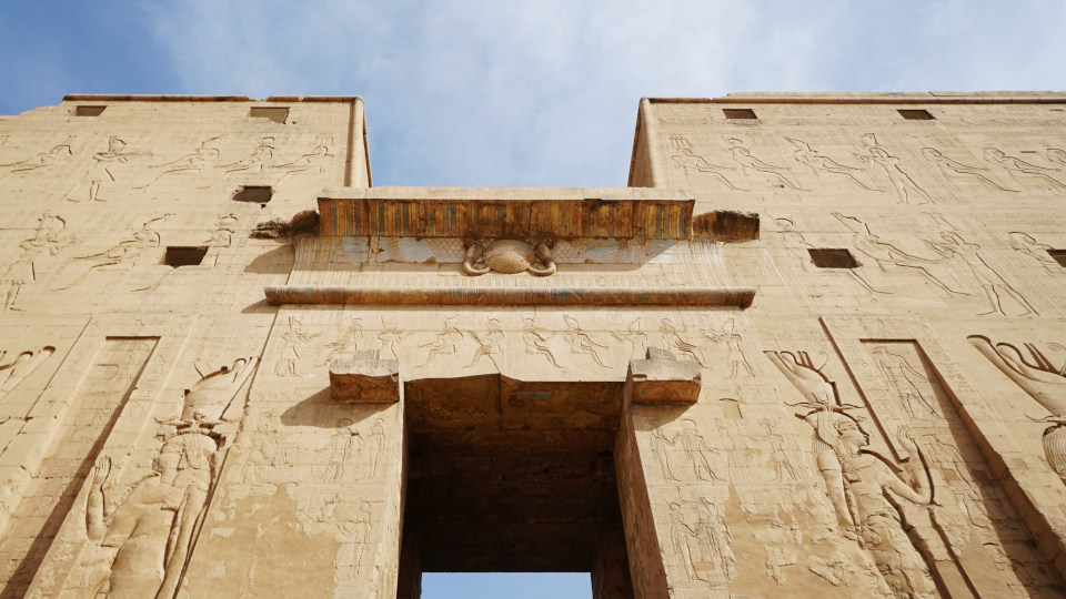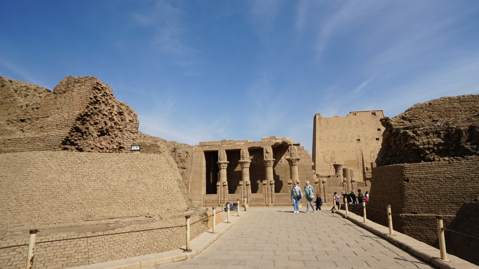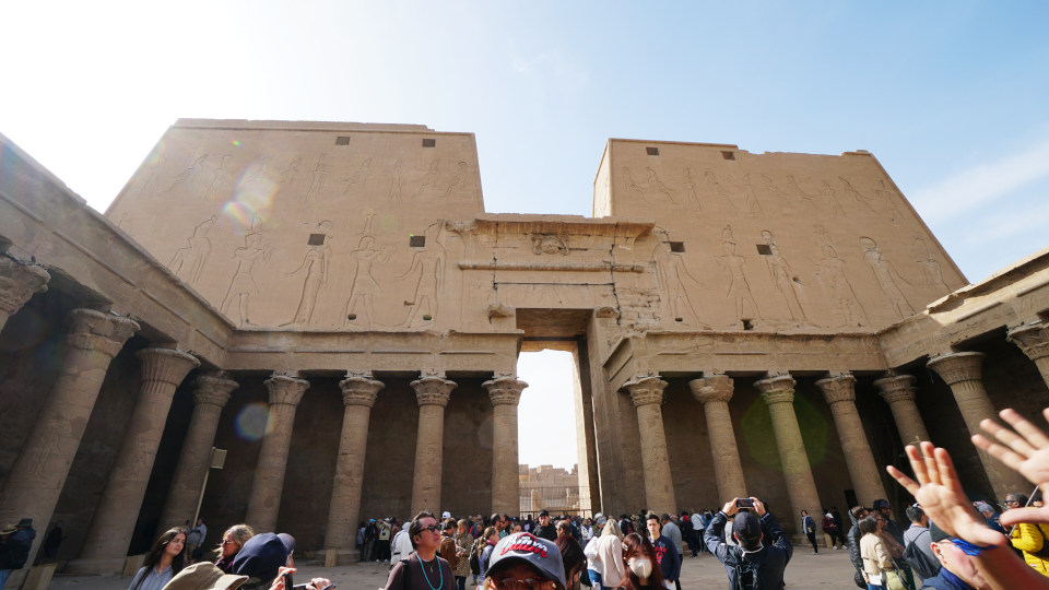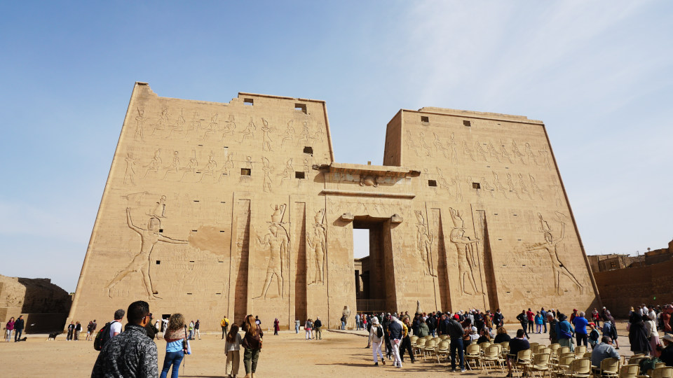 「ホルス神殿」の巨大な塔門、エジプトの遺跡の中でも最も保存状態が良いと言われ、塔門の高さは36メートル、「ホルス神殿」は紀元前237年にプトレマイオス3世によって造られ始めて、約180年後のプトレマイオス12世が完成したと言われています、プトレマイオス12世は有名なクレオパトラのお父さんです。