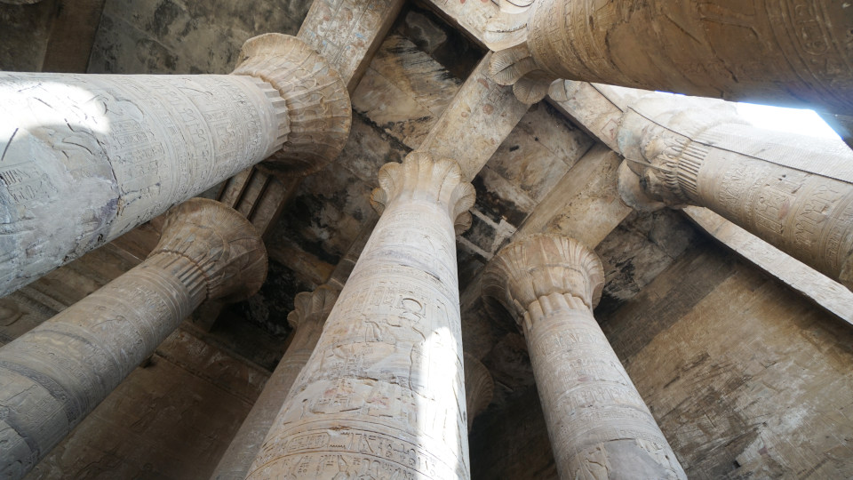 第一列柱室、他の遺跡ではほとんど残っていない天井がしっかりと残されています、柱上部のデザインがいろいろ。