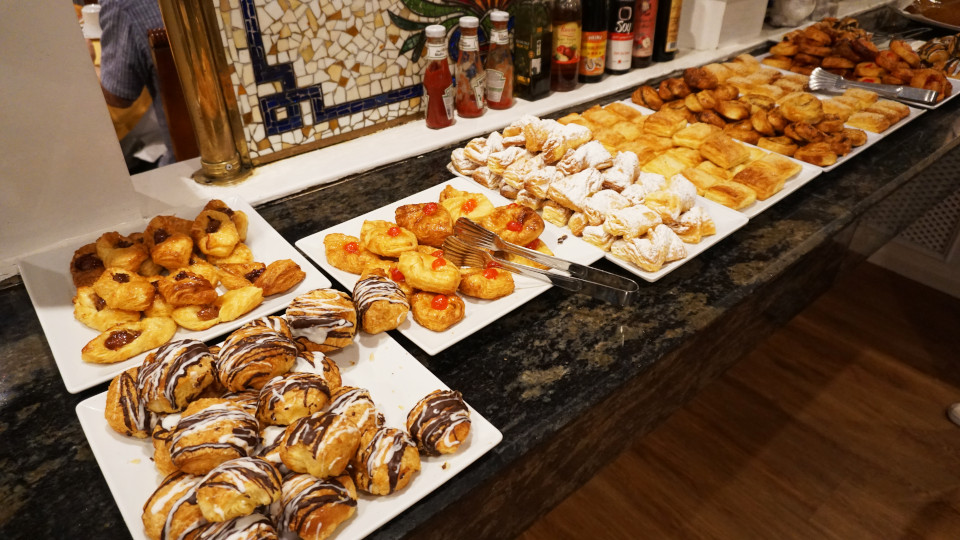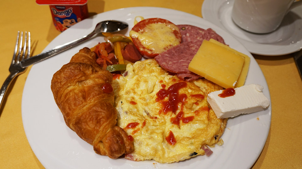 この日の朝のプレート、朝が早くてもしかりといただきます、クロワッサンとひとつづつ焼いてくれるオムレツがメイン。