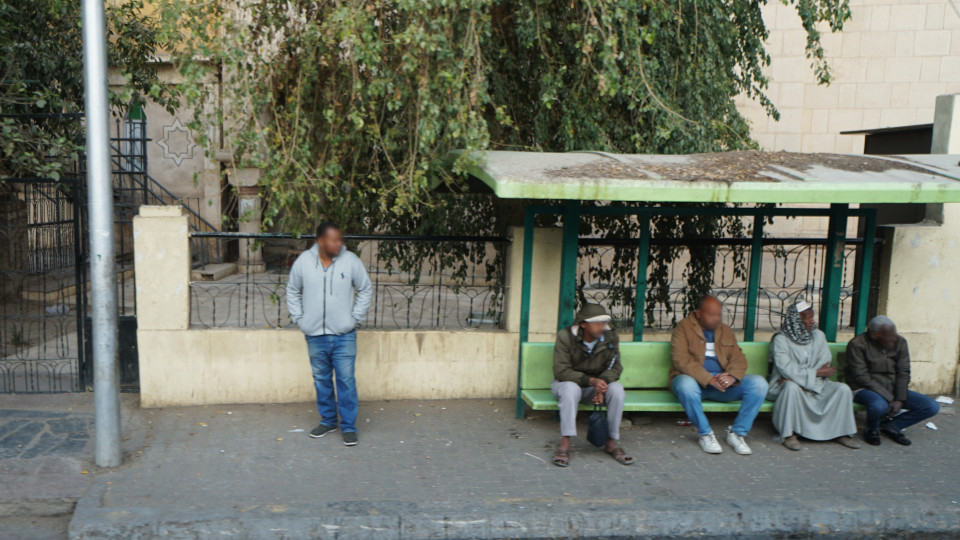 午前6時30分、アスワンのクルーズ船乗り場からツアーバスで「イシス神殿」向かいます、バスの車窓からの景色、路線バスの待合所でバスを待つ人たち、この街でもバス停の表示がわかりません。