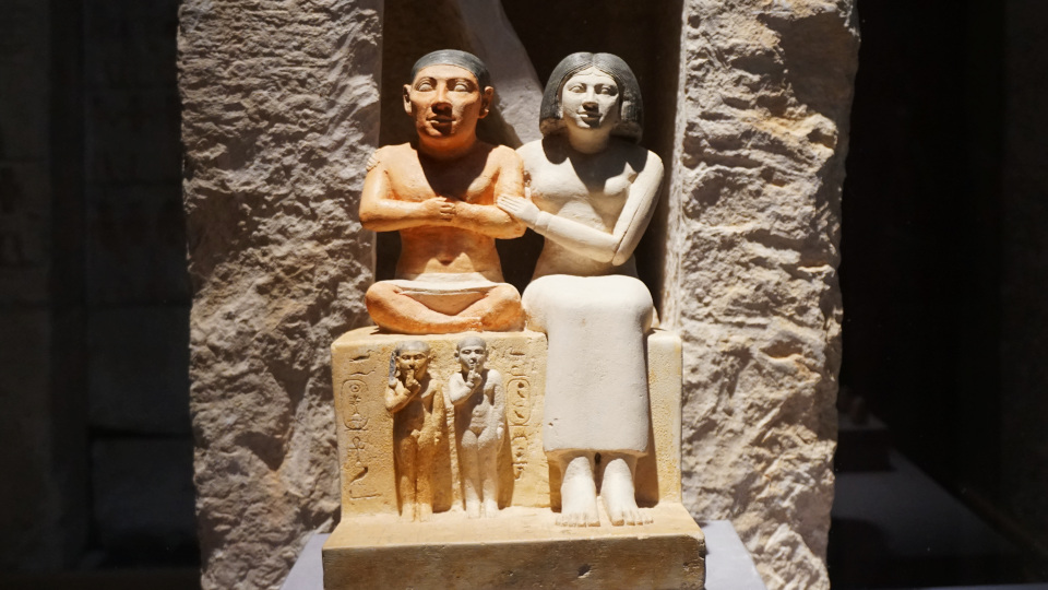 「ゼネブと家族の像」セネブはクフ王の葬儀で祭司だった人物、小人症だったと言われ奥さんが肩と腕を支え、足元にいる子供とともに微笑ましい像になっています。