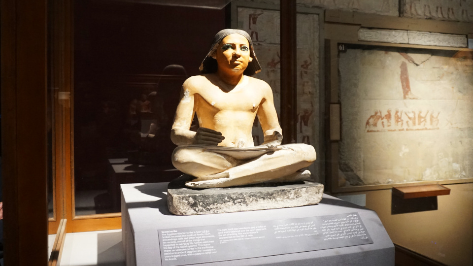 「書記官」サッカラで見つかった書記座像、組んだ足の上にはパピルスの巻物がのっています、この座像はエジプト200ポンド紙幣の裏面に描かれているそうです。
