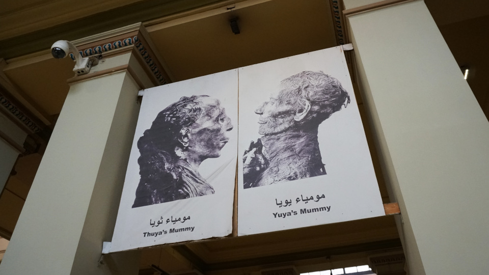 アメンへテプ3世の王妃ティイの両親、チュウヤ(左)とイウヤ(右)のミイラの大きな写真、ツタンカーメンはひ孫になります、大エジプト博物館に大部分が移送された後は、エジプト考古学博物館のメイン展示になるとみられています。