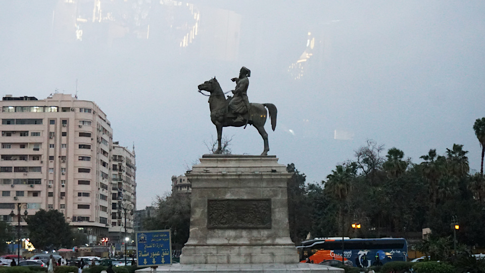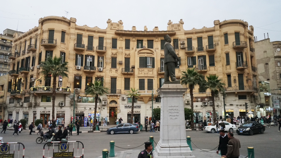 誰かの銅像?記念碑?「タラート・ハルブ広場」後ろには趣のある建物(ホテル?)が建ています。