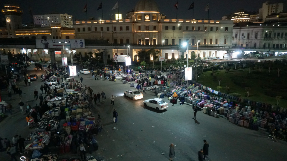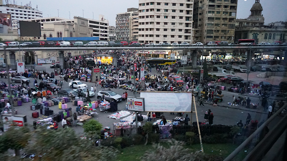 「エジプト考古学博物館」からバザールへ向かう途中の車窓からの景色、大きなローターリーです、「タハリール広場」中央にオベリスク、その周りにスフィンクスが配置されています、そしてさすがにこの大きさには必要でしょう「信号機」がありました。