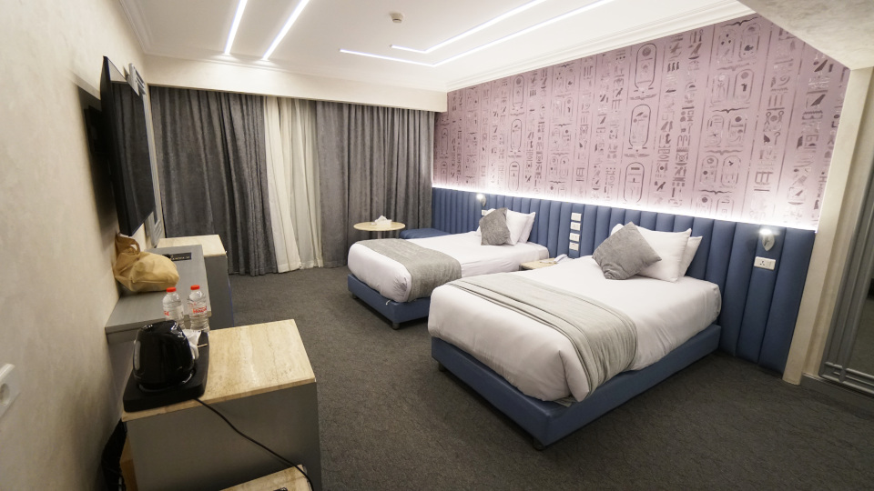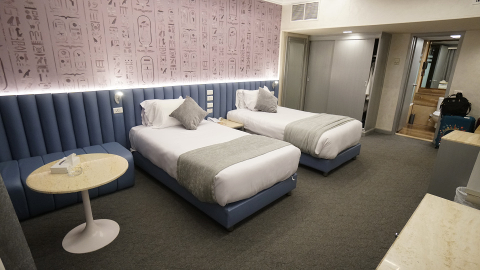 さてホテルには午後10時ほどの到着、エジプト最後のホテルはラグジュアリークラスの「ピラミッド・パーク・リゾート・ホテル」、グーグルMapの上空写真を見ると、大きなプールを持つ素敵なホテルですが、お部屋の中はこんな感じ、入り口ドア側から。